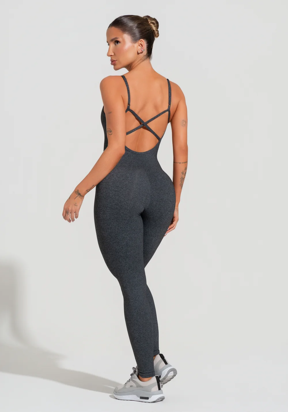 O macacão mescla é uma peça única que traduz liberdade e estilo. Com alças finas reguláveis e costas com detalhe em tiras cruzadas, ele se ajusta perfeitamente ao corpo, valorizando a silhueta com segurança e conforto.